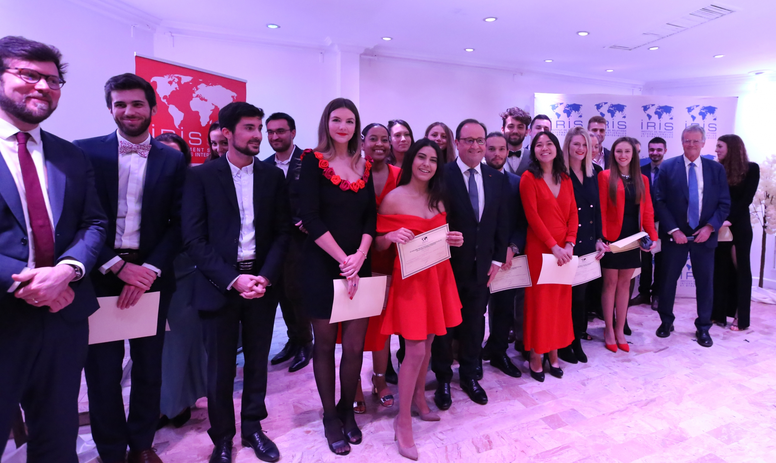 Christine Aubrée, a ensuite présenté l’ensemble des équipes, administrative et pédagogique, qui suivent les étudiants toute l’année, puis les partenaires académiques, notamment Jacques Serba et Daniel Le Guyader, directeur de l’IPAG de Brest et Jean-François Fiorina directeur adjoint de Grenoble Ecole de management.Les diplômés se sont vus remettre en main propre leur diplôme par Pascal Boniface et François Hollande, ainsi que par les responsables pédagogiques de chacune des promotions. Les diplômés des filières Géopolitique et prospective, Géoéconomie et intelligence stratégique et Défense, sécurité et gestion de crise ont également reçu un certificat commun IRIS/GEM.