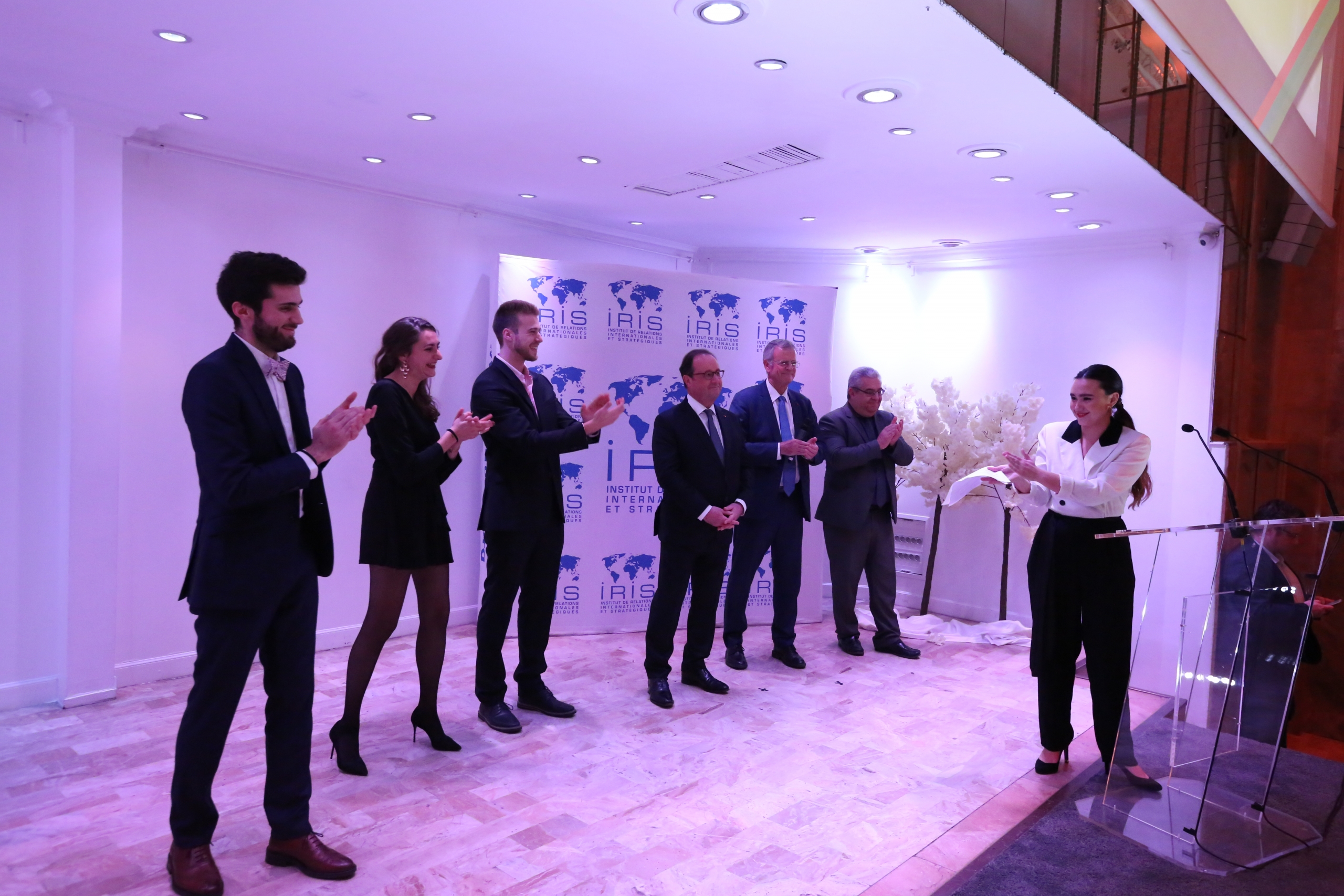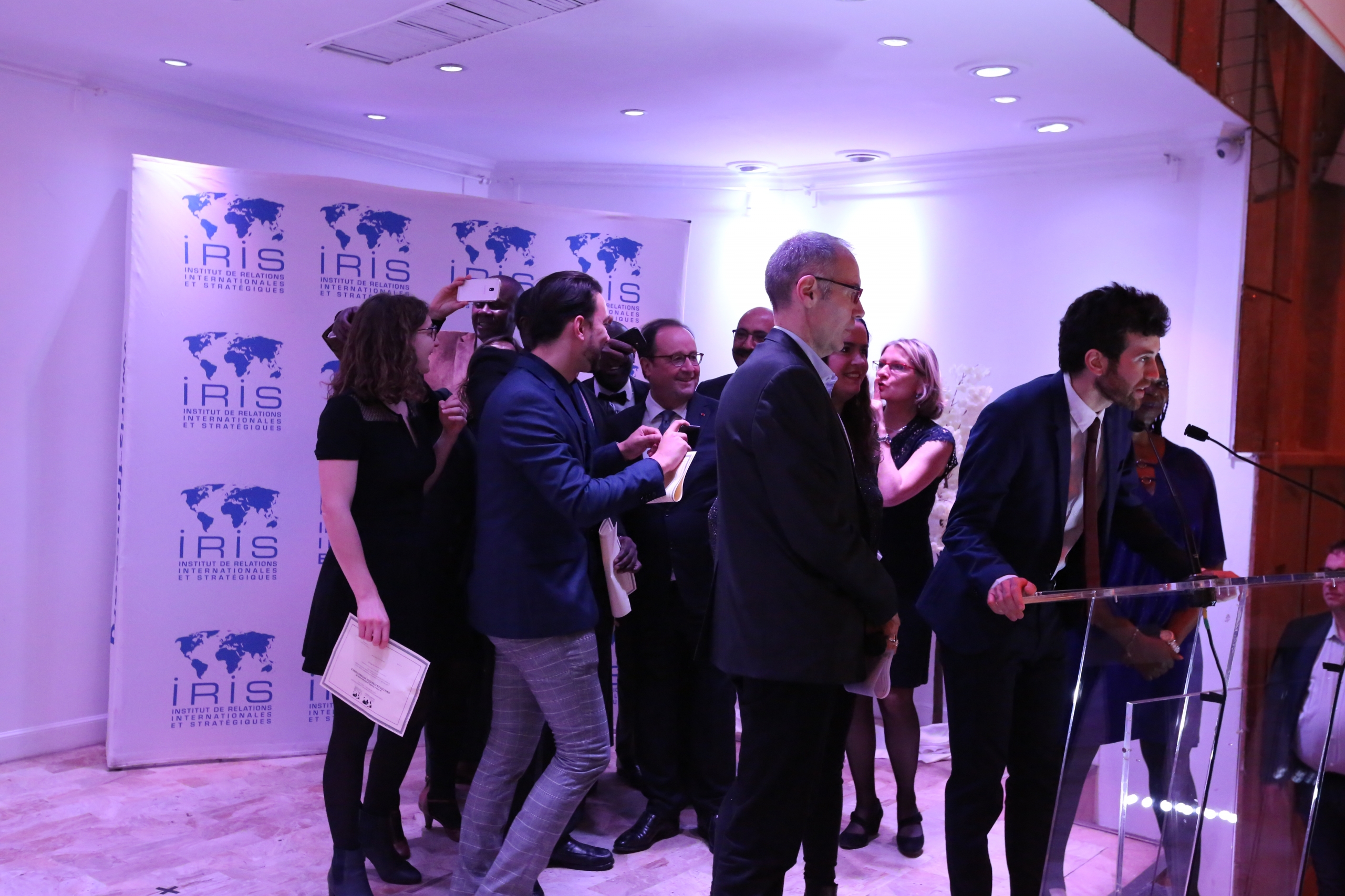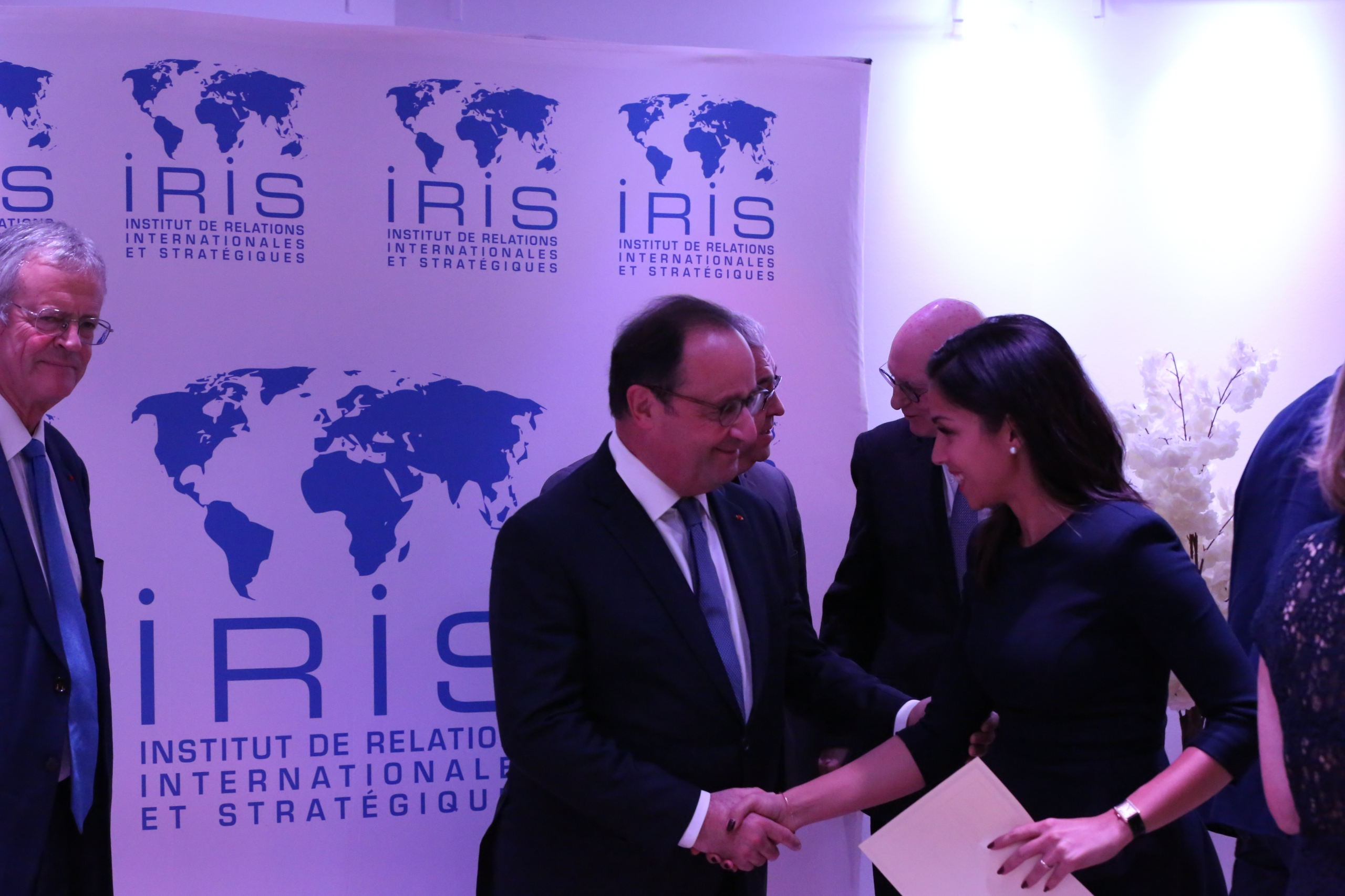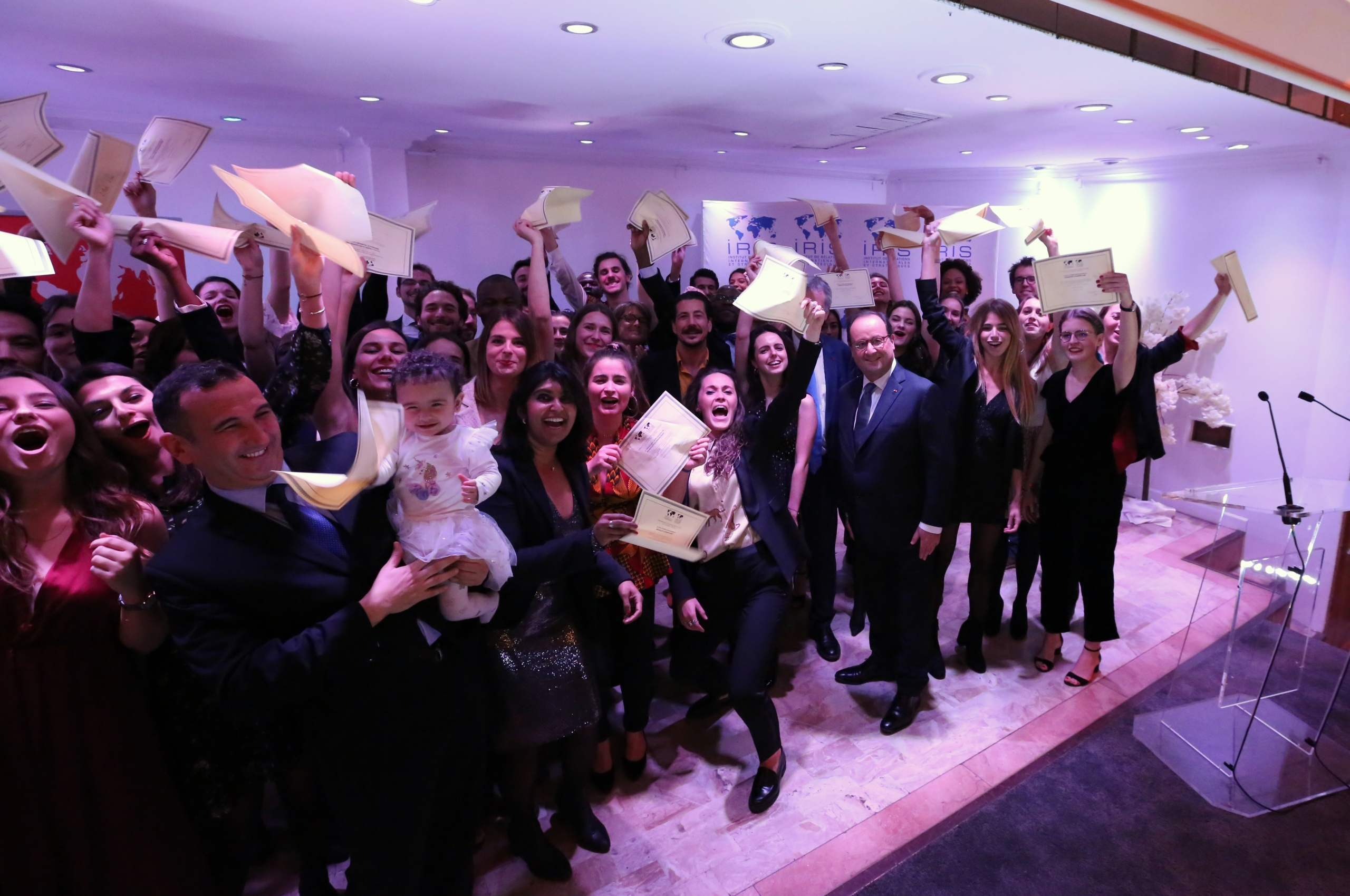 Vendredi 29 novembre 2019, dans Les Salons Hoche à Paris, s’est tenue la cérémonie de remise des diplômes des promotions 2019 sous le parrainage exceptionnel de M. François Hollande, ancien Président de la République française. Près de 700 personnes étaient présentes : diplômés, enseignants, parents, amis, équipes pédagogiques, personnels de l’IRIS et d’IRIS Sup’, tous venus féliciter les nouveaux diplômés.Christine Aubrée, directrice des formations, puis Pascal Boniface, directeur de l’IRIS, ont introduit la cérémonie, cédant la parole à François Hollande pour un discours retraçant les grands moments géopolitiques de son quinquennat. L’ancien président de la République n’a pas manqué de féliciter les nouveaux diplômés, tout en leur faisant des recommandations pour l’avenir.