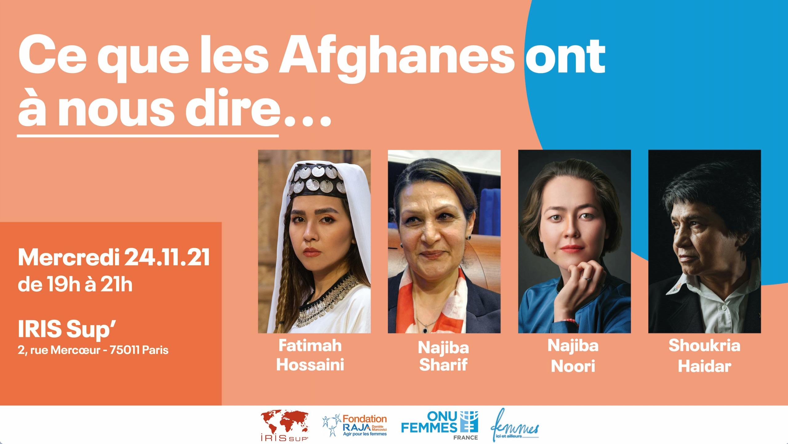 Le 24 novembre 2021, les étudiants d’IRIS Sup’ ont eu le plaisir de pouvoir assister à la conférence « Ce que les Afghanes ont à nous dire… » co-organisée avec ONU Femmes et Femmes ici et Ailleurs et soutenue par la Fondation Raja.A l’occasion de cette table ronde, Fatimah Hossaini, photographe, fondatrice et directrice de Mastooraat (lieu de résidence et d’exposition à Kaboul), Najiba Sharif, vice-ministre des Femmes de 2003 à 2005 en Afghanistan et ancienne députée, Najiba Noori, journaliste de l’Agence France Presse en Afghanistan et Shoukria Haïdar, association NEGAR-Soutien aux Femmes d’Afghanistan, ont offert aux étudiants un éclairage sur la situation des droits des femmes en Afghanistan.