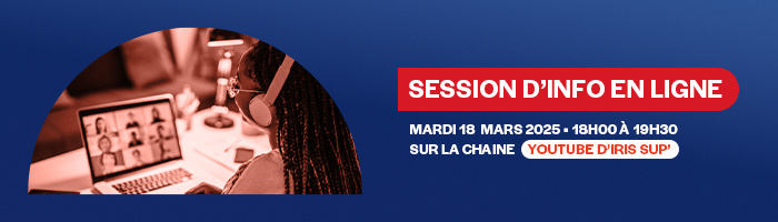 Profitez de notre session d’information en ligne qui aura lieu le MARDI 17 MARS 2026 de 18h à 19h30 sur la chaîne YouTube d’IRIS Sup’ pour découvrir l’ensemble des formations longues en présentiel et à distance, les modalités d’étude, des conseils sur les candidatures et les financements, la vie associative d’IRIS Sup’ et les formations courtes.