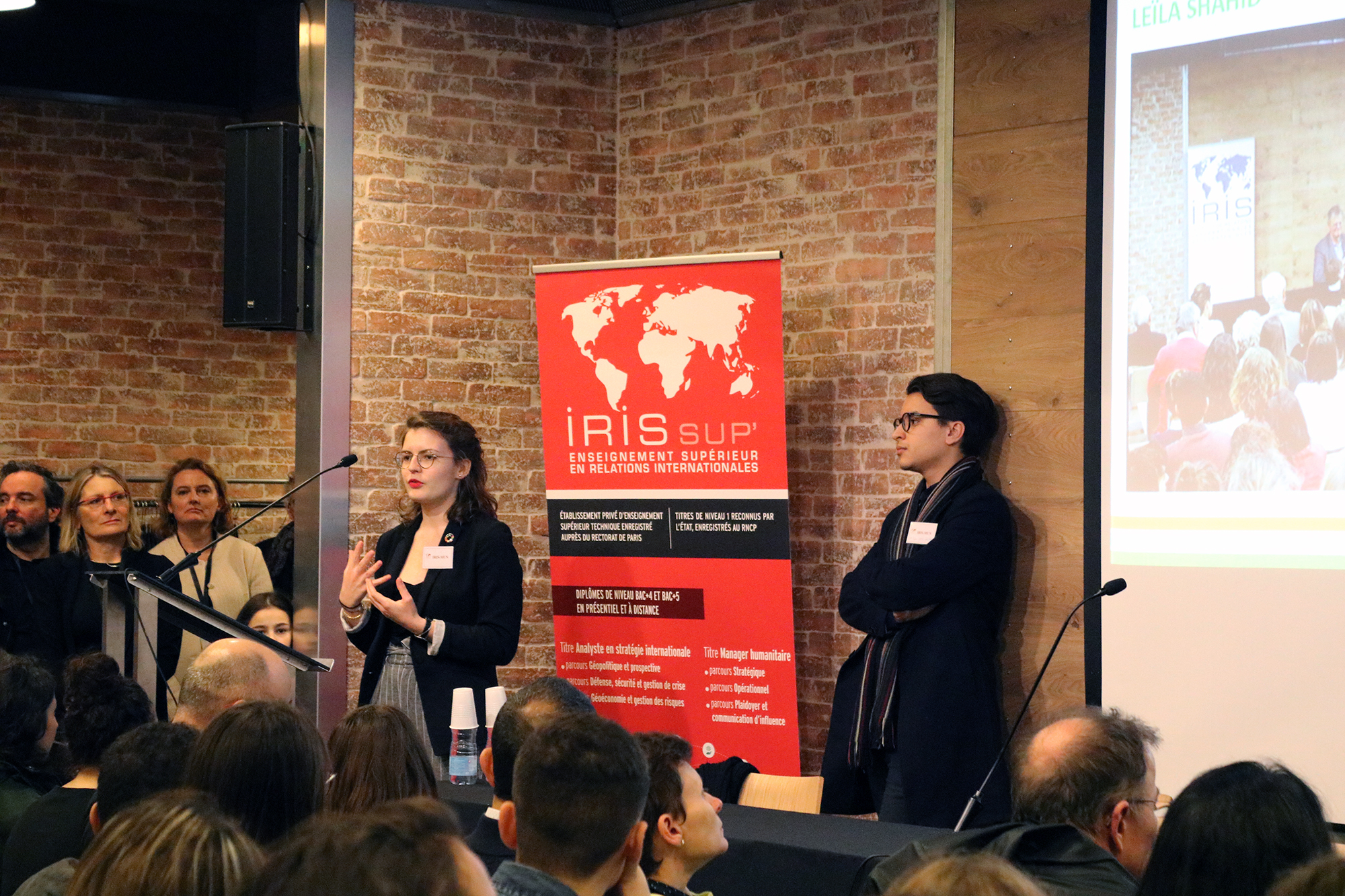 La directrice des formations de l’IRIS, Christine Aubrée, a ensuite présenté les membres de l’équipe administrative et pédagogique. Elle a rappelé les caractéristiques communes des différentes formations d’IRIS Sup’ reconnues par l’État, de niveau 1 (bac+5) : de la géopolitique appliquée aux problématiques et aux enjeux internationaux des organisations, des intervenants tous professionnels, une part importante accordée aux mises en situation et expériences professionnelles.Christine Aubrée a également évoqué l’ouverture à la rentrée de deux nouveaux parcours à distance : Défense, sécurité et gestion de crise et Manager humanitaire – Responsable de programmes internationaux, venant s’ajouter aux deux parcours Relations internationales 1re année et Géopolitique et prospective déjà existants.